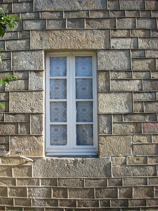 Plounévez-Moëdec, Kergaër : ferme (alignement de trois logis et d'une grange), élévation antérieure sud, double logis central, détail d'une fenêtreImmatriculation