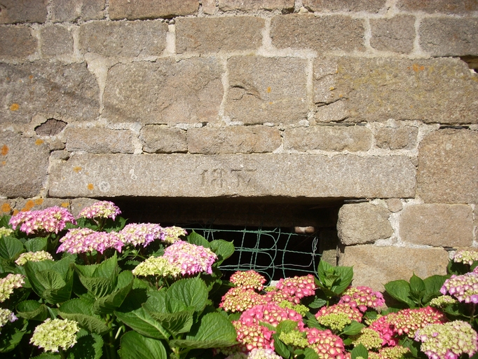 Plounévez-Moëdec, Kergaër : ferme, ancien édifice limite 16e siècle 17e siècle transformé vraisemblablement en dépendance (ouest), détail du linteau daté 1837Immatriculation