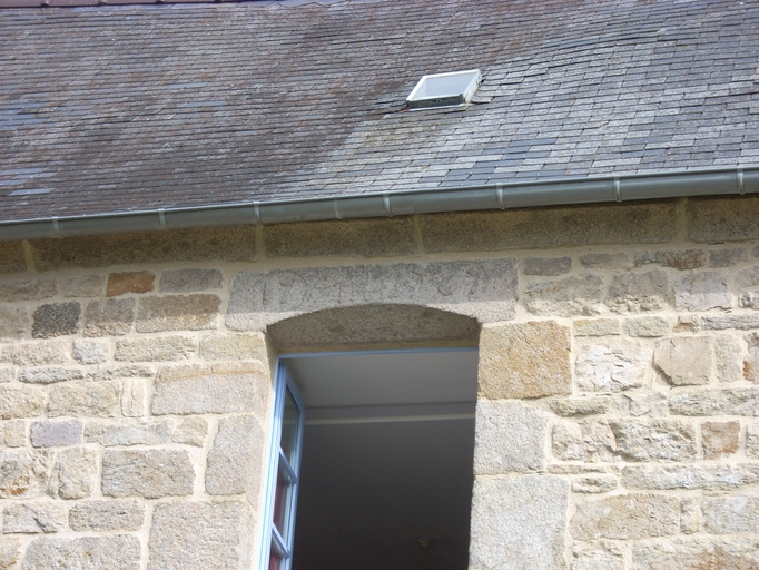 Plounévez-Moëdec, le bourg : presbytère, élévation antérieure orientée sud, détail du linteau de la fenêtre de l'étage portant l'inscription 17 IHS 67Immatriculation