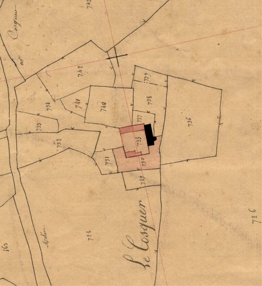 Extrait du cadastre ancien de la commune de Plounévez-Moëdec, 1834 : Le Cosquer (en noir)Immatriculation