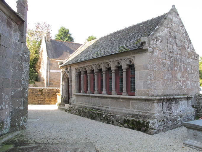 Lanvellec, le bourg : ossuaire, élévation antérieure orientée sud-est. L'édifice est ouvert de sept arcades à arc trilobé séparées par des colonnettes jumeléesImmatriculation