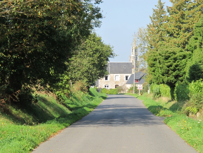 Lanvellec, Saint-Carré, rue Toulic Hamon : entrée sud-est du village. En arrière-plan : la chapelle Notre-Dame-de-PitiéImmatriculation