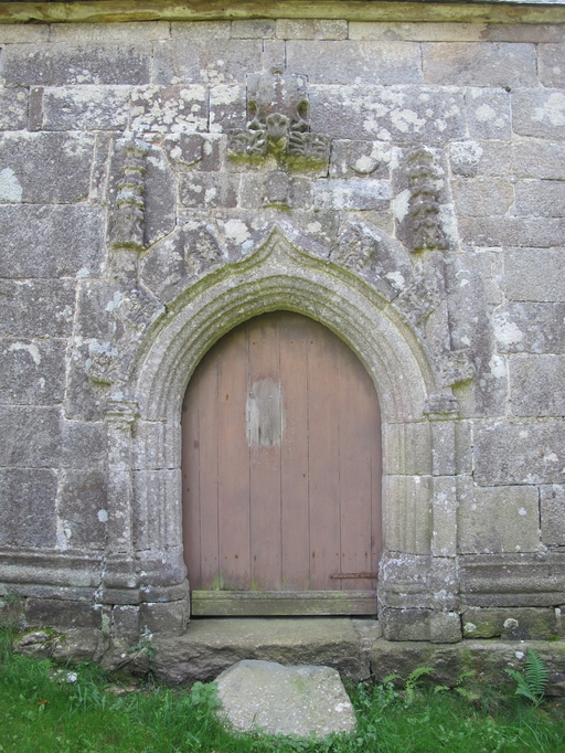 Lanvellec, Saint-Goulven : chapelle, élévation nord, porte à voussures avec arc en accolade soutenant des fleurons en croix et pinaclesImmatriculation