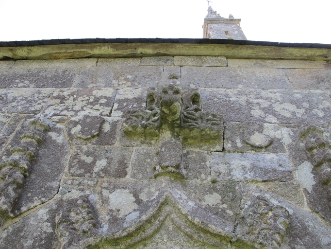 Lanvellec, Saint-Goulven : chapelle, élévation nord, détail de la porte à voussures avec arc en accolade soutenant des fleurons en croix et pinaclesImmatriculation