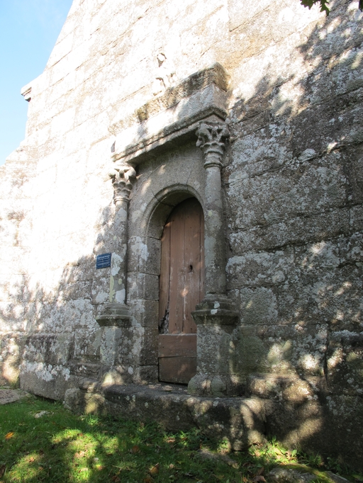Lanvellec, Saint-Goulven : chapelle, mur-pignon ouest, porte en plein cintre encadrée de deux colonnes avec chapiteau et fronton sculpté d'une pietà ou Vierge de PitiéImmatriculation