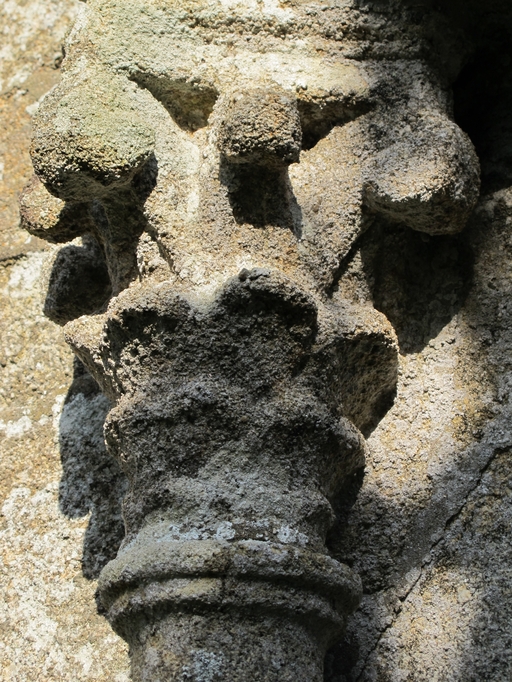 Lanvellec, Saint-Goulven : chapelle, mur-pignon ouest, détail de la porte en plein cintre encadrée de deux colonnes avec chapiteau et fronton sculpté d'une pietà ou Vierge de PitiéImmatriculation