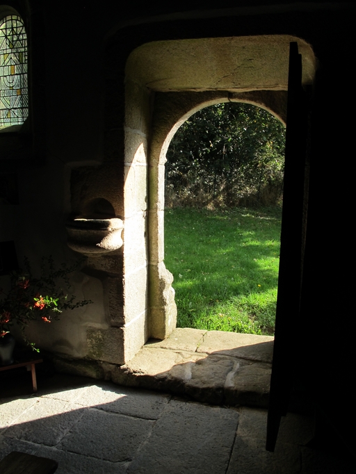 Lanvellec, Saint-Goulven : chapelle, vue intérieure. Porte sud en plein cintre et bénitierImmatriculation