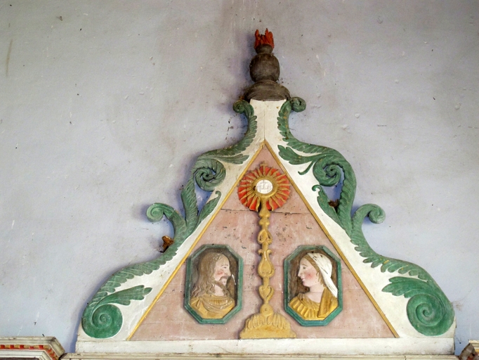 chapelle, vue intérieure. Détail du retable en bois sculpté et peint du 17e siècle représentant la Cène en haut-reliefImmatriculation