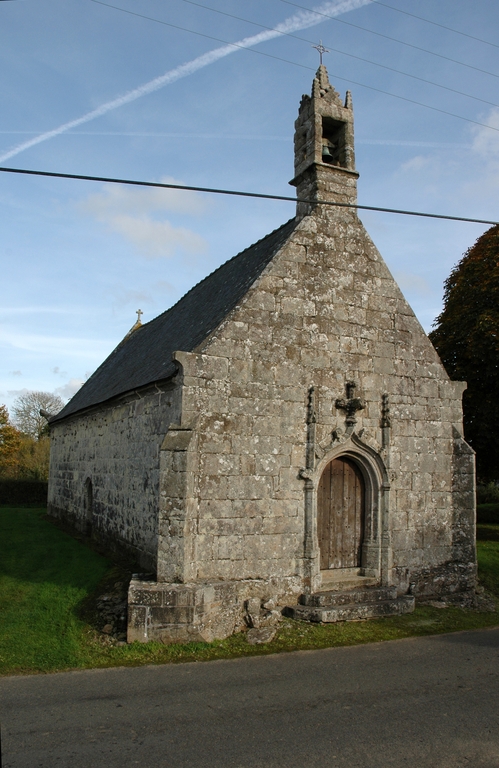 Lanvellec, Saint-Maudez : chapelle, mur-pignon ouest couronné d´un clocheton de plan rectangulaire à chambre de cloche ajourée et orné d´une croix en fer forgéImmatriculation