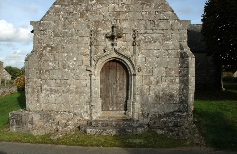 Lanvellec, Saint-Maudez : chapelle, mur-pignon ouest, porte à voussures avec arc en accolade soutenant des fleurons en croix et pinaclesImmatriculation