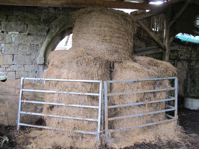 Lanvellec, Goaz Ru : basse cour aujourd'hui couverte par un hangar, entrée monumentale. La porte charretière est surmontée d'une archivolte ornée d'au moins deux écusImmatriculation
