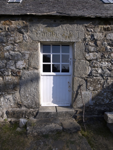 Logis de maréchal-ferrant, 1814. Détail de la porte avec linteau gravé d'une tenaille, d'un marteau et des initiales du propriétaire. EY 7Immatriculation