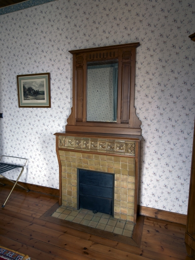 Chambre de l'étage, détail de la cheminée en carreaux de faïence vernissée avec décor de frise de roses en reliefImmatriculation