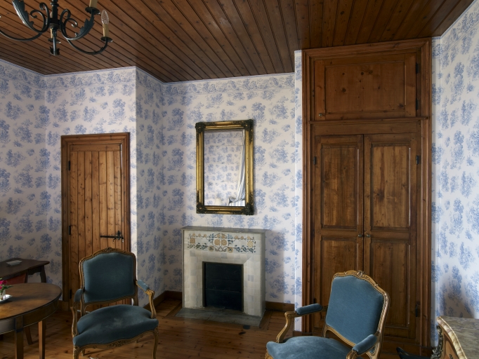 Chambre de l'étage, vue intérieure avec cheminée en carreaux de céramique vernissé peints d'un décor de motifs de rosesImmatriculation
