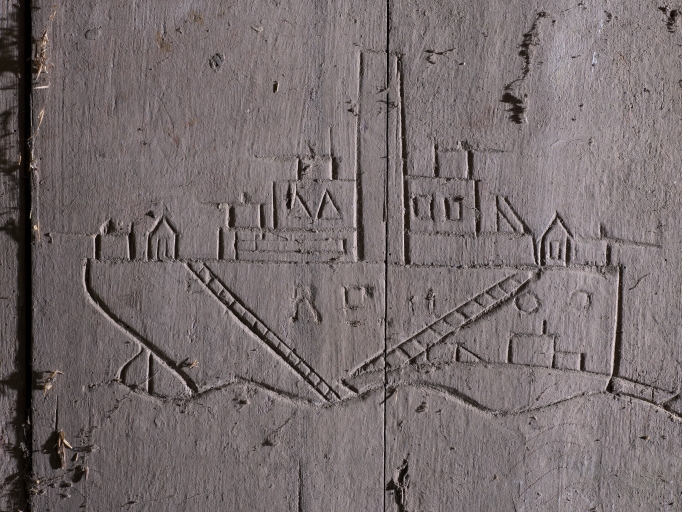 Kervéleyen, ferme, détail de graffiti sur la porte charretièreImmatriculation