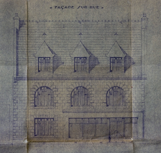 Dessin de la façade principale de la maison Labasque, 1948, signé Y. Ollivier et B. Papillot (collection particulière Labasque).Immatriculation
