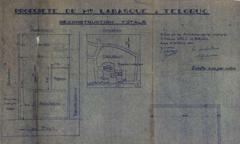 Plan de situation et d'implantation de la maison Labasque, rue de la mairie, 1948, signé Y. Ollivier et B. Papillot (collection particulière Labasque)Immatriculation