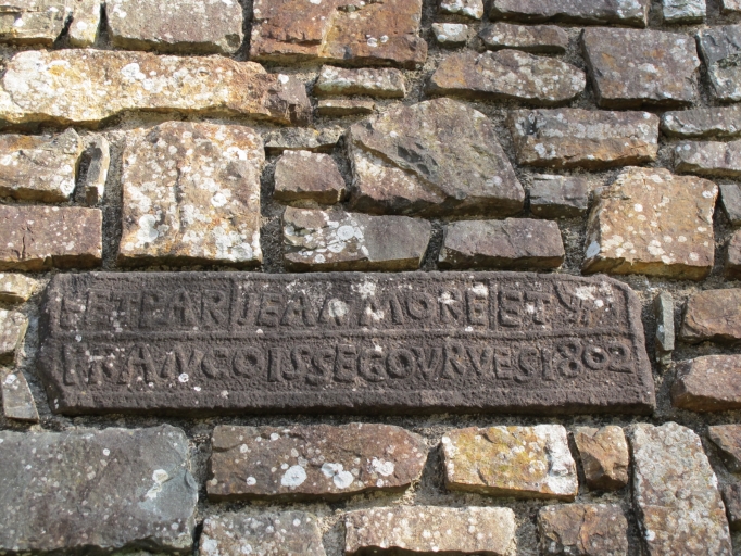 Moulin de Ronvarc'h. Pierre remployée avec inscription et date de fondation du moulinImmatriculation