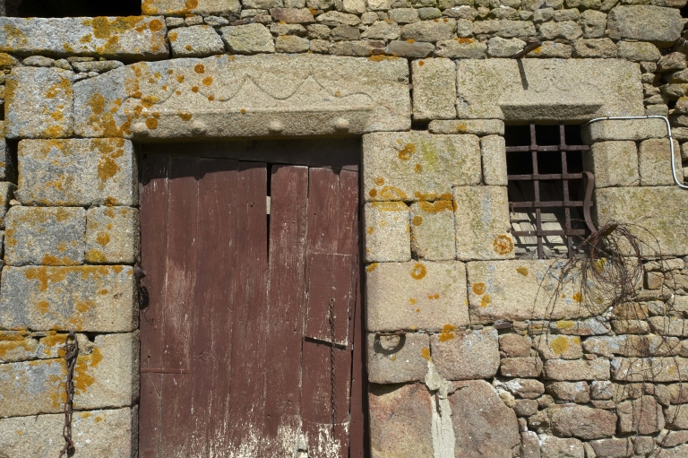 Maison du 17e siècle : détail du linteau de la porte orné de boules et de la petite fenêtre décorée d'une accolade et d'une grilleImmatriculation