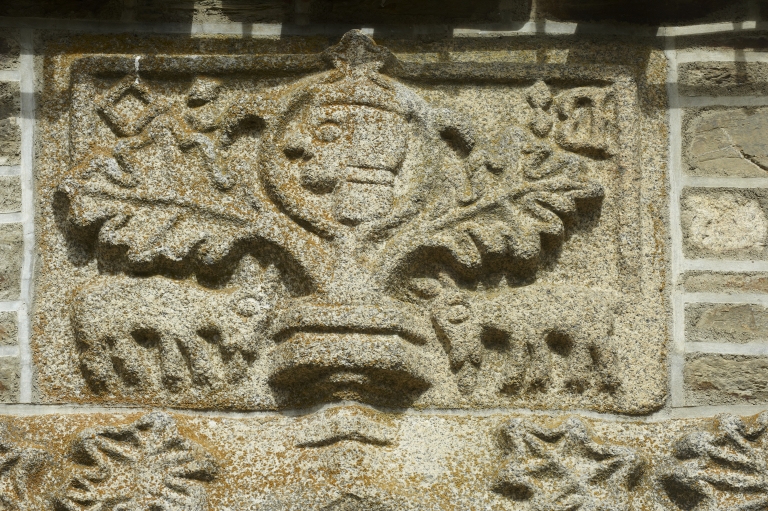 Détail du décor sculpté : tête d'homme, animaux et feuillesImmatriculation