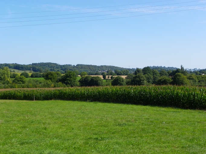 Saint-Germain-en-Coglès, les toits du village dans leur écrin boisé.Immatriculation