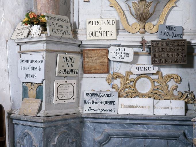 Les ex-voto sous la statue de la Vierge à l'Enfant (état en 2011)Immatriculation