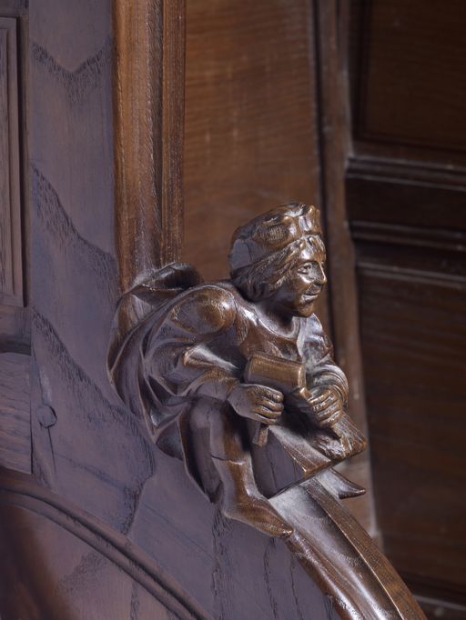 Stalles sud, décor d'un accoudoir : tailleur de pierre (état en 2011)Immatriculation