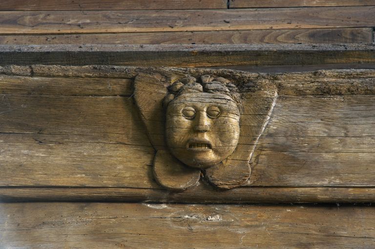Nef, mur sud, sablière : tête de femme à la collerette en forme d'ailes de papillon (état en 2011)Immatriculation