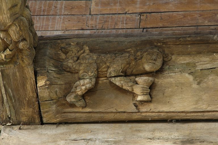 Nef, mur nord, sablière : homme sauvage recouvert d'écailles (?) tenant une coupe à pied (état en 2011)Immatriculation