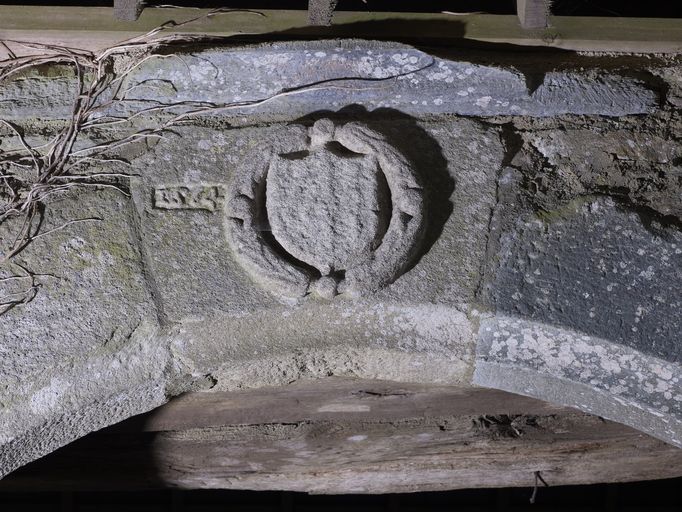 Manoir, passage couvert : clé de voûte portant des armoiries et la date 1564 (état en 2011)Immatriculation