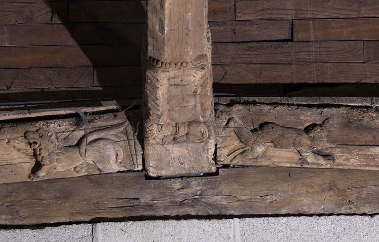 Nef, mur sud, sablière : à gauche de l'entrait 1, un lion ailé ; à droite, un homme trébuchant ou plongeant (état en 2011)Immatriculation