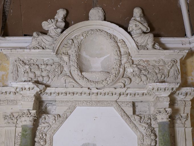 Manoir, chapelle : partie supérieure de l'autel-retable du 17e siècle (état en 2011)Immatriculation
