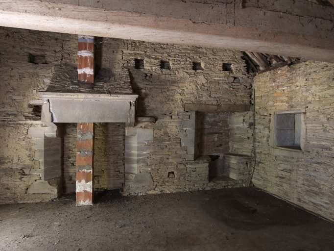 Manoir, logis nord, 1er étage, pièce sud, angle sud-ouest : cheminée, fenêtre à coussièges et niche (état en 2011)Immatriculation