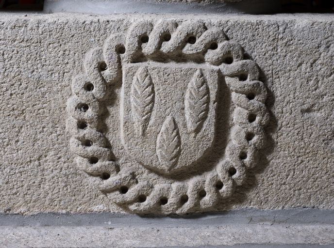 Église, pierre remployée sous l'autel face aux fidèles : les armoiries pourraient être celles de la famille de la Pommeraye, de sable à trois pommes de pin d'or (état en 2011)Immatriculation
