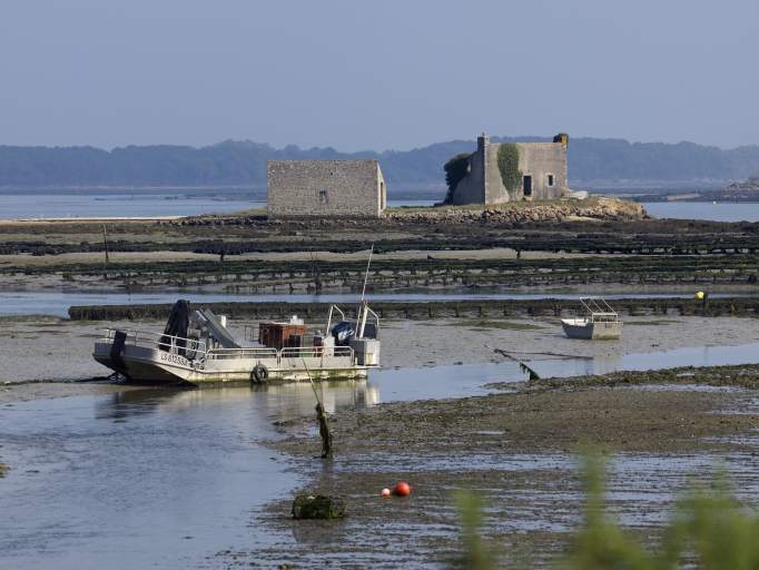 Plouhinec. Vue des maisons de gardiens de parc de l'île de Miniavec et parcs ostréicolesImmatriculation