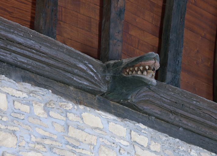 Église, choeur, mur nord : blochet en forme de monstre (état en 2011)Immatriculation