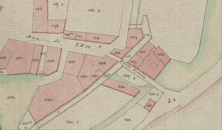 Plan cadastral de 1807-1809 : section I3 détail porte Poterne. AD Morbihan 3P 297.Immatriculation