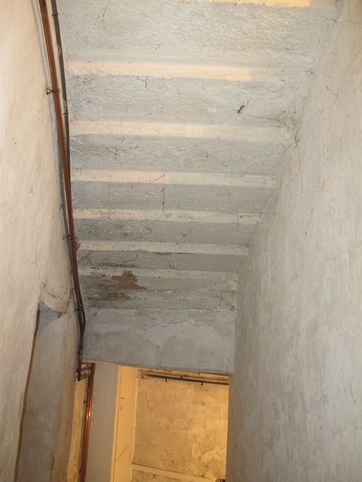 Tour d'escalier, dessous de la volée du premier étage, marches scellées partiellement délardéesImmatriculation