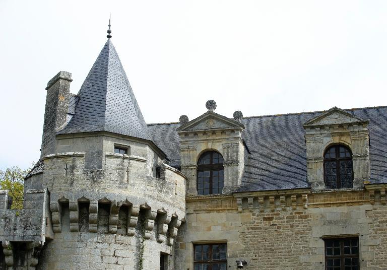 Détail, tour fortifiée et partie haute du château ( corniche et lucarnes en pierre de taille des faluns)Immatriculation