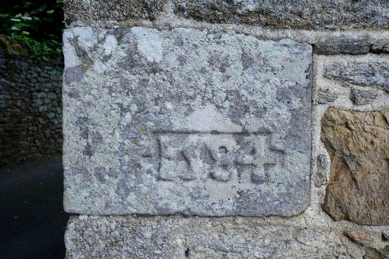 Détail, pierre de remploi dans l'angle de la façade ouest, porte la date de 1584Immatriculation