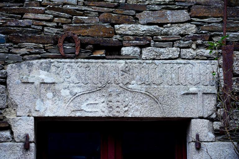 Détail : linteau de la porte d'entrée avec inscription et pics de tailleur de pierreImmatriculation