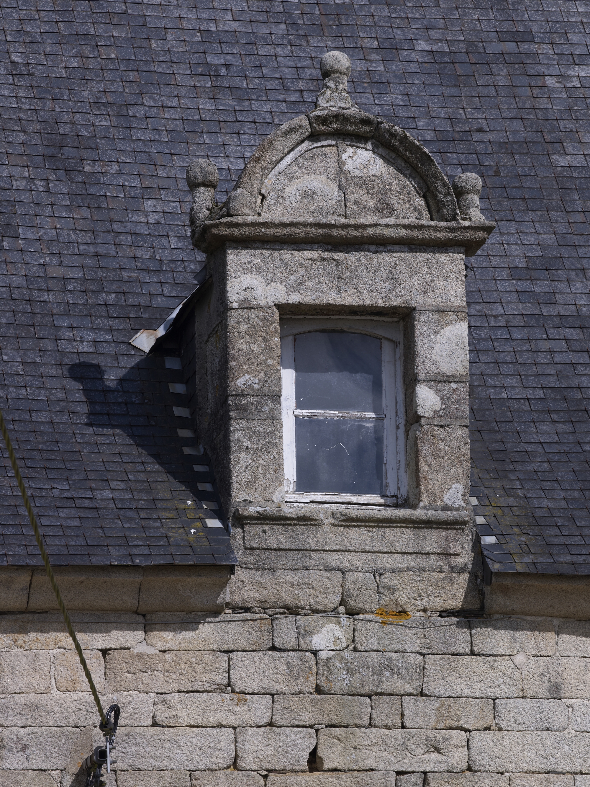 Plougras, Menez Riou : manoir, partie gauche datée de 1675. Lucarne à fronton cintré orné d´acrotères en bouleImmatriculation