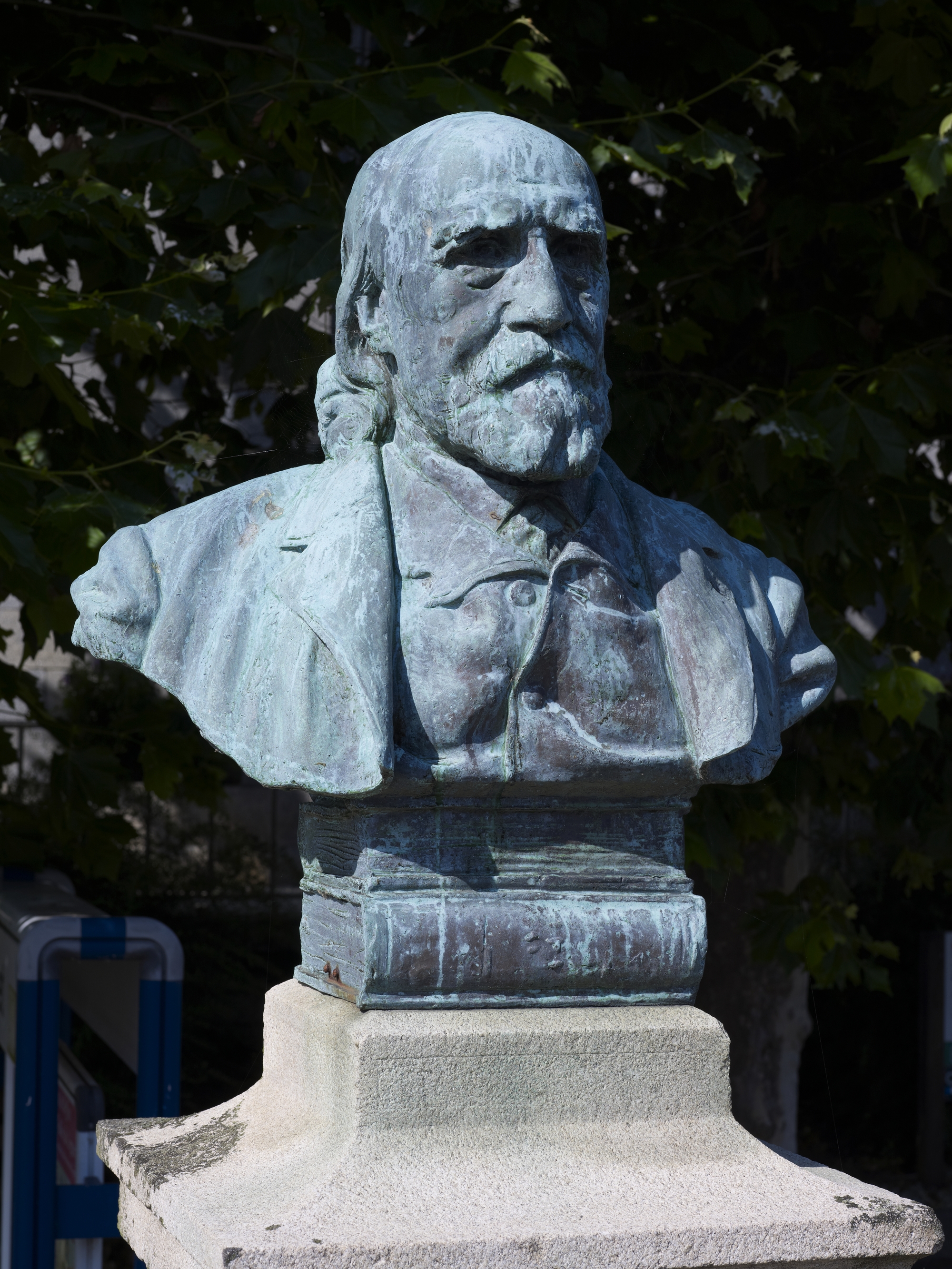 Vue du buste de François-Marie Luzel reposant sur trois épais livres (état en 2012)Immatriculation