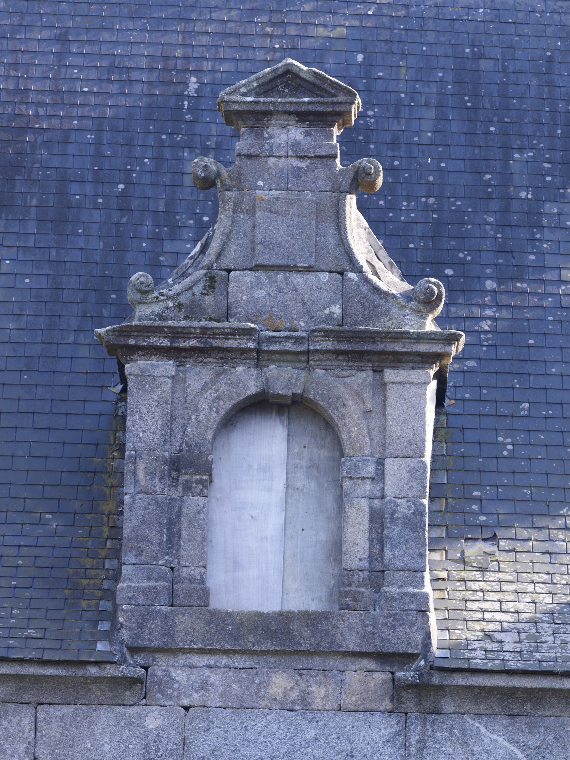 Plouaret, Guernanchanay : manoir et cour intérieure. Elévation nord, détail de la lucarne à fronton triangulaire (ouest)Immatriculation