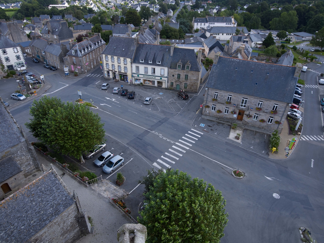 Plouaret : vue depuis le clocher de l'église paroissiale Notre-Dame, la place de l'Eglise et la mairieImmatriculation