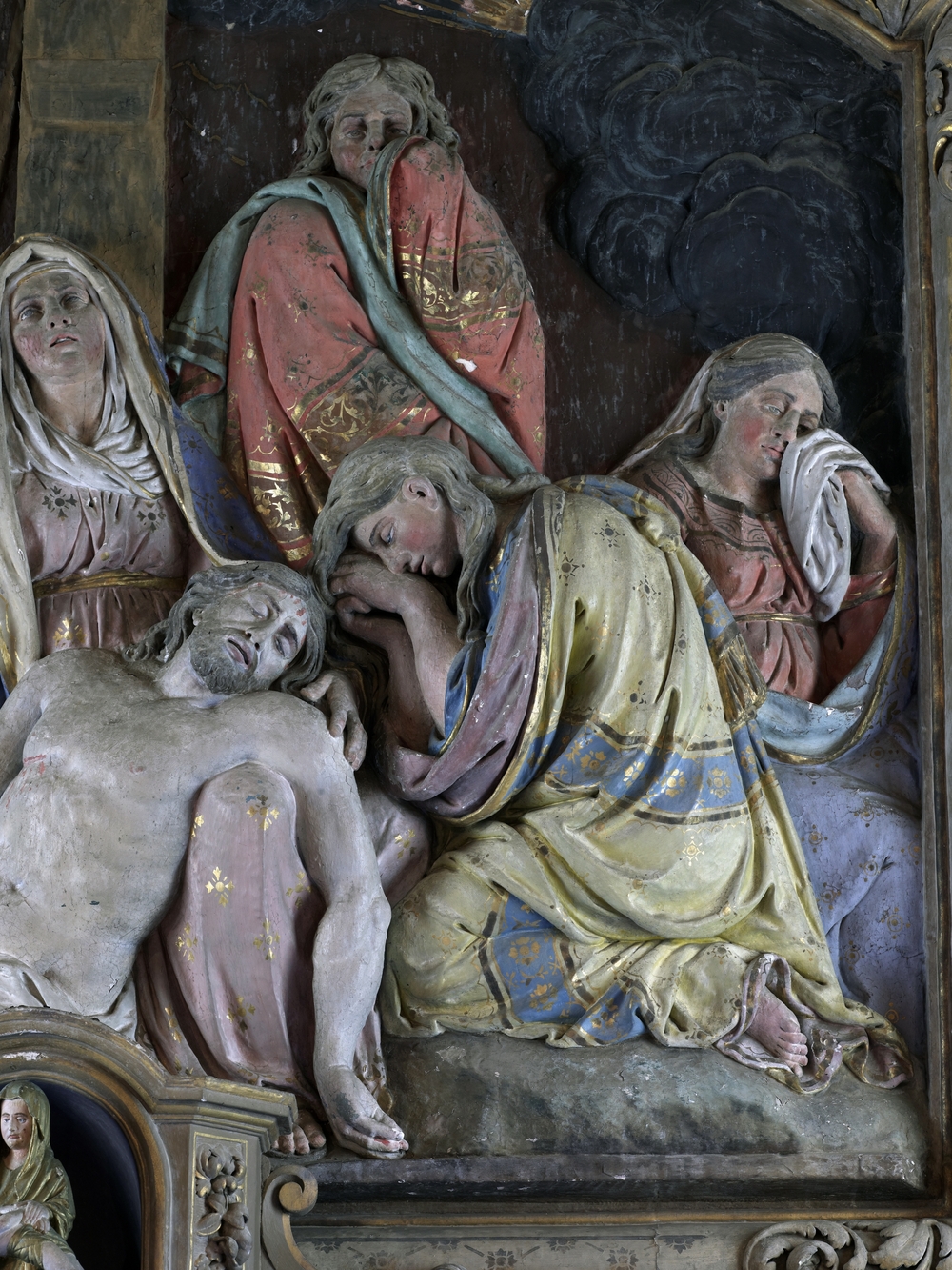 Lanvellec, Saint-Carré : chapelle Notre-Dame-de-Pitié, vue intérieure, détail de la Pietà ou Vierge de Pitié du maître-autelImmatriculation