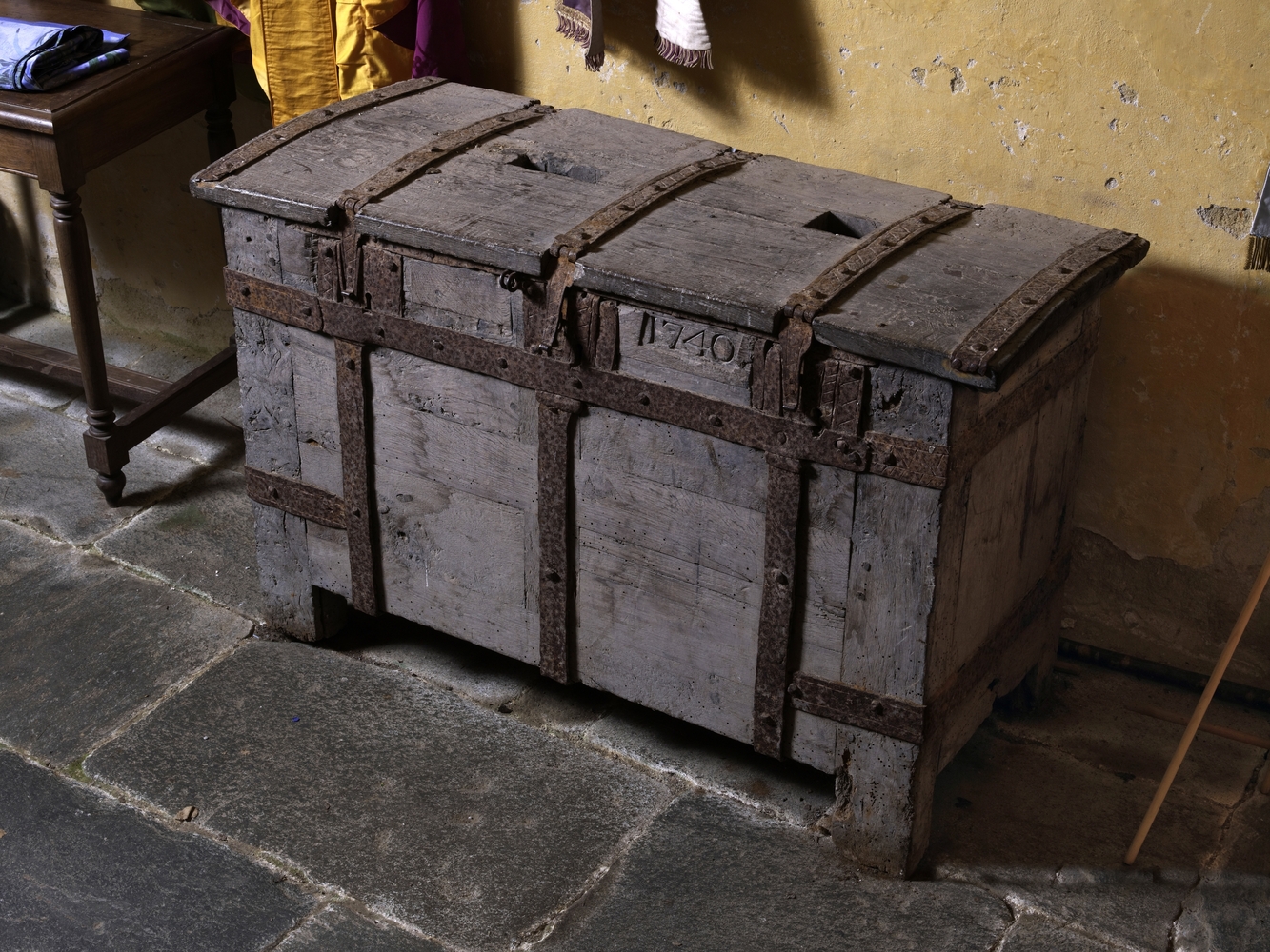 Lanvellec, Saint-Carré : chapelle Notre-Dame-de-Pitié, vue intérieure, coffre-fort de fabrique (administration des finances affectées à la construction et l'entretien d'une église ou d'une chapelle). Il porte la date 1740Immatriculation