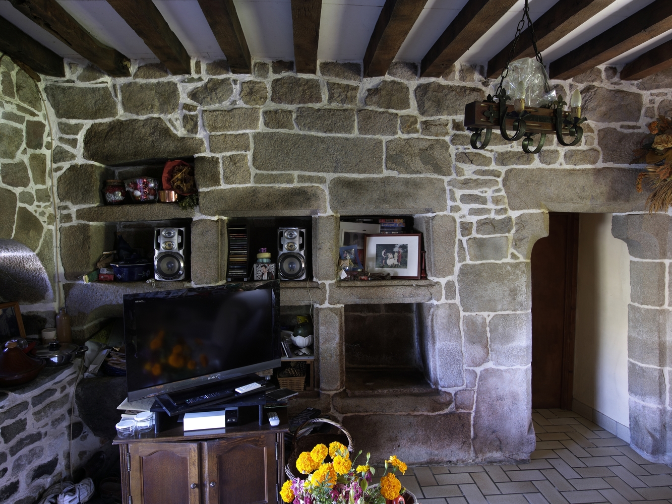 Lanvellec, Goaz Ru : manoir, vue intérieure, rez-de-chaussée, placards muraux de la salle ; porte à linteau sur corbeletsImmatriculation