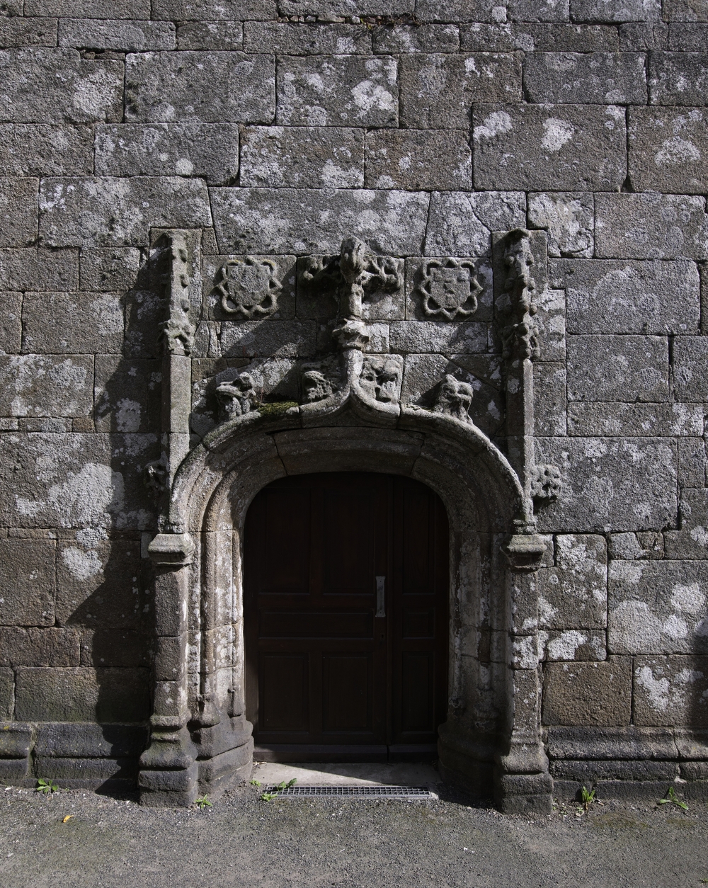 Plouaret : chapelle Sainte-Barbe, porte ouest en anse de panier ornée surmontée d'une archivolte en accolade, choux frisés, fleuron encadré de pinacles et par deux blasons (fin 15e siècle ?)Immatriculation