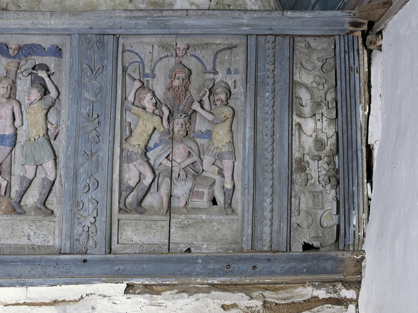 Tribune en bois polychrome, compartiment sculpté représentant des scènes de la Passion, le Christ aux liensImmatriculation